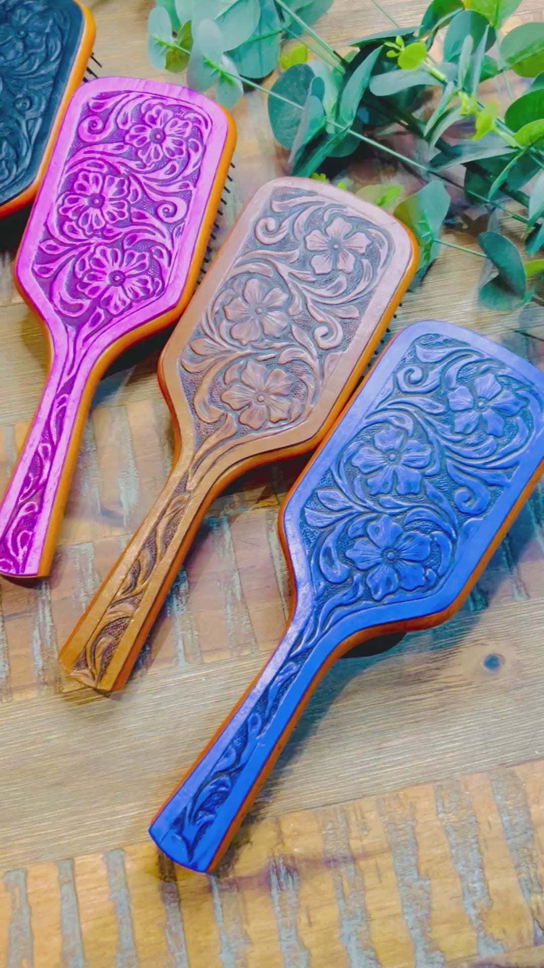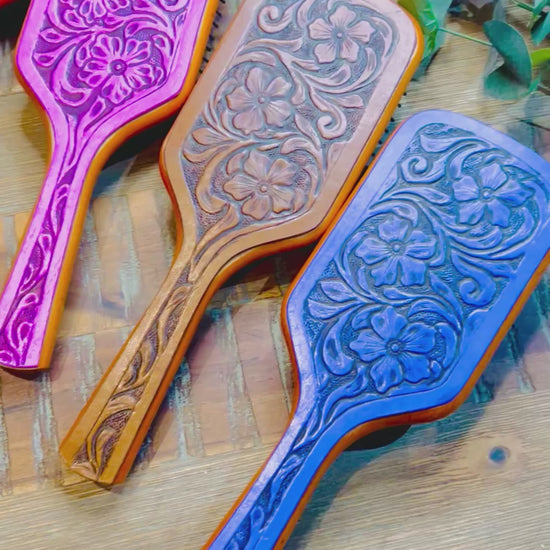 These stunning wooden hairbrushes feature a hand-carved leather backing and are hand-painted with vibrant colours. They are unique, bold and rustic. Buy a hairbrush that stands out in both beauty and craftsmanship.