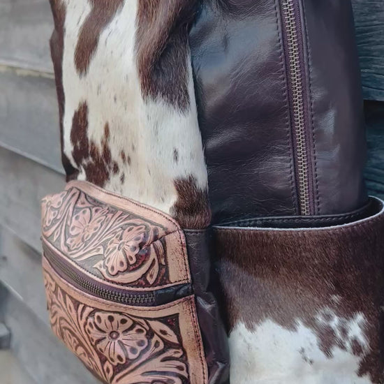 This oversized hand-tooled leather & cowhide backpack is perfect for school, work or a nappy bag.