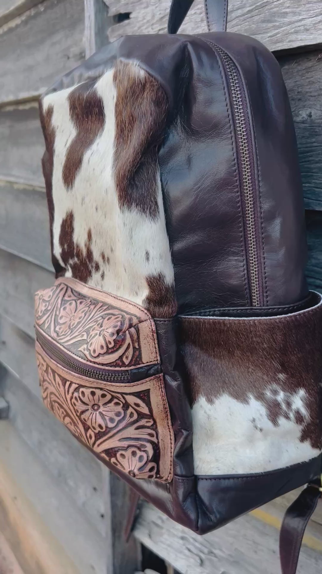 This rugged genuine leather & cowhide backpack features an intricate hand-tooled leather pockets, combining durability and style. Perfect for carrying all your essentials in style on your next adventurer. It offers a timeless design with handcrafted details, blending tradition and modern function.