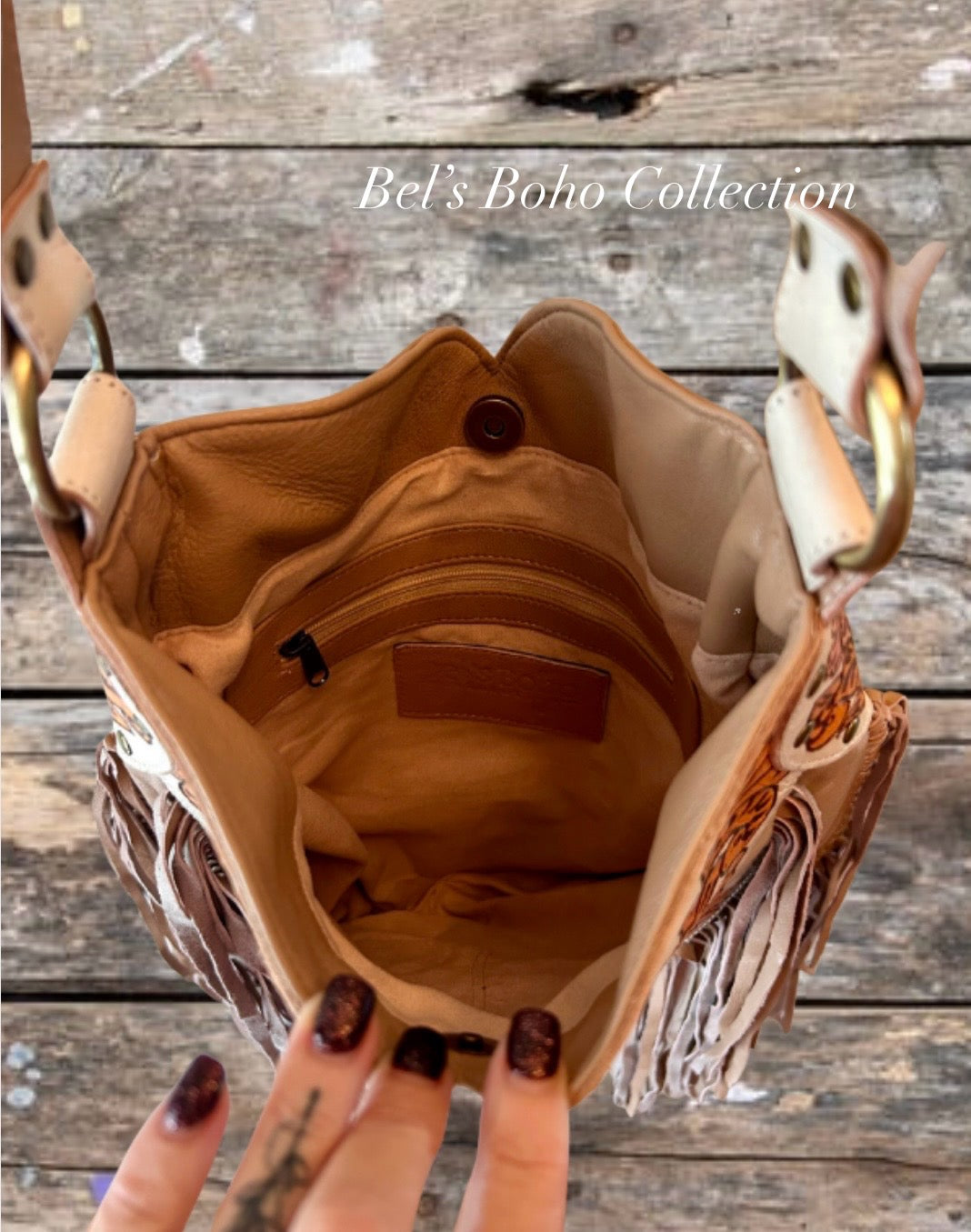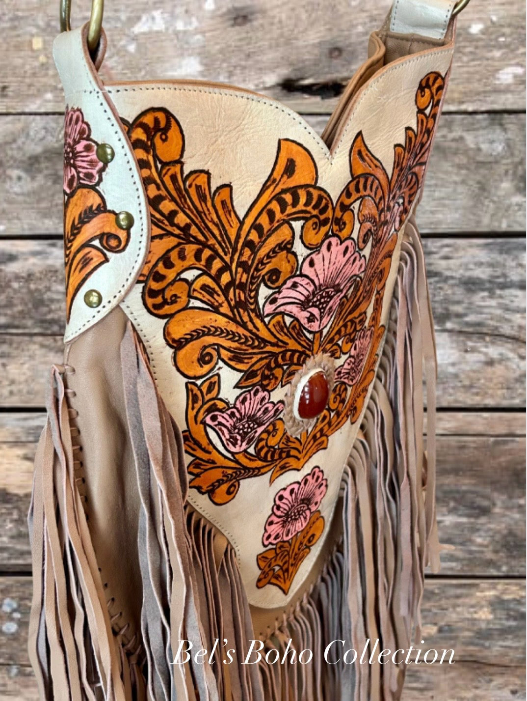 Turn heads with this stunning hand-carves leather shoulder bag, crafted for the free-spirited soul. Featuring an intricate hand-painted floral design in warm oranges & soft pinks, this piece is brought to life with a centre gemstone accent & long flowing fringe that adds movement & charm to every step.