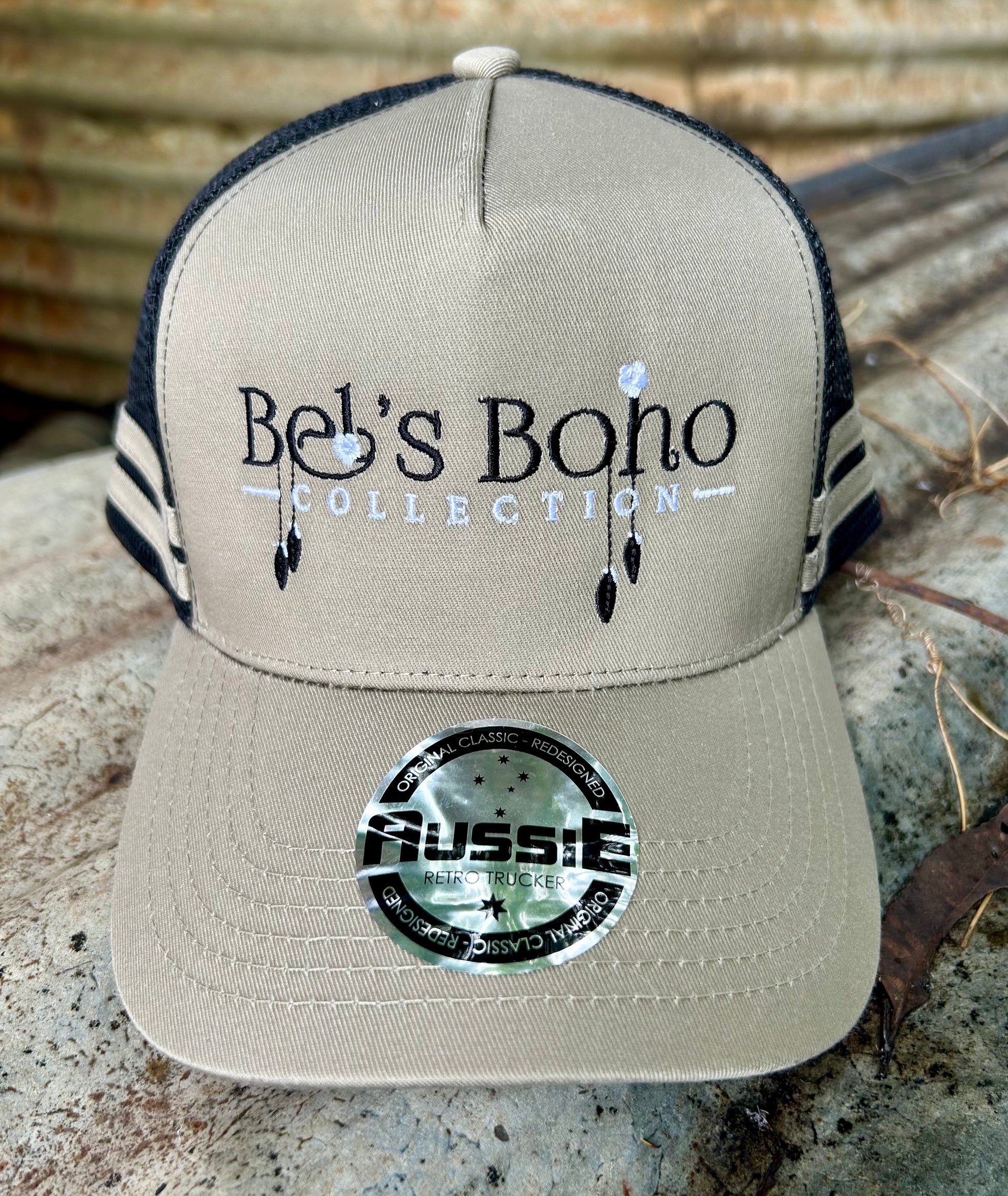 This cap features the Bel’s Boho Collection logo embroidered across the front in black & white.