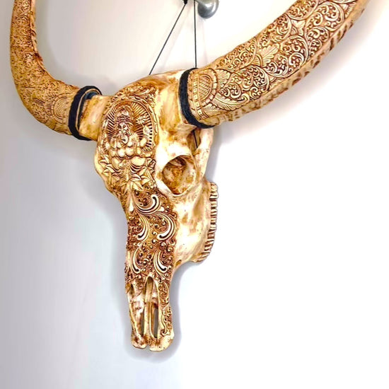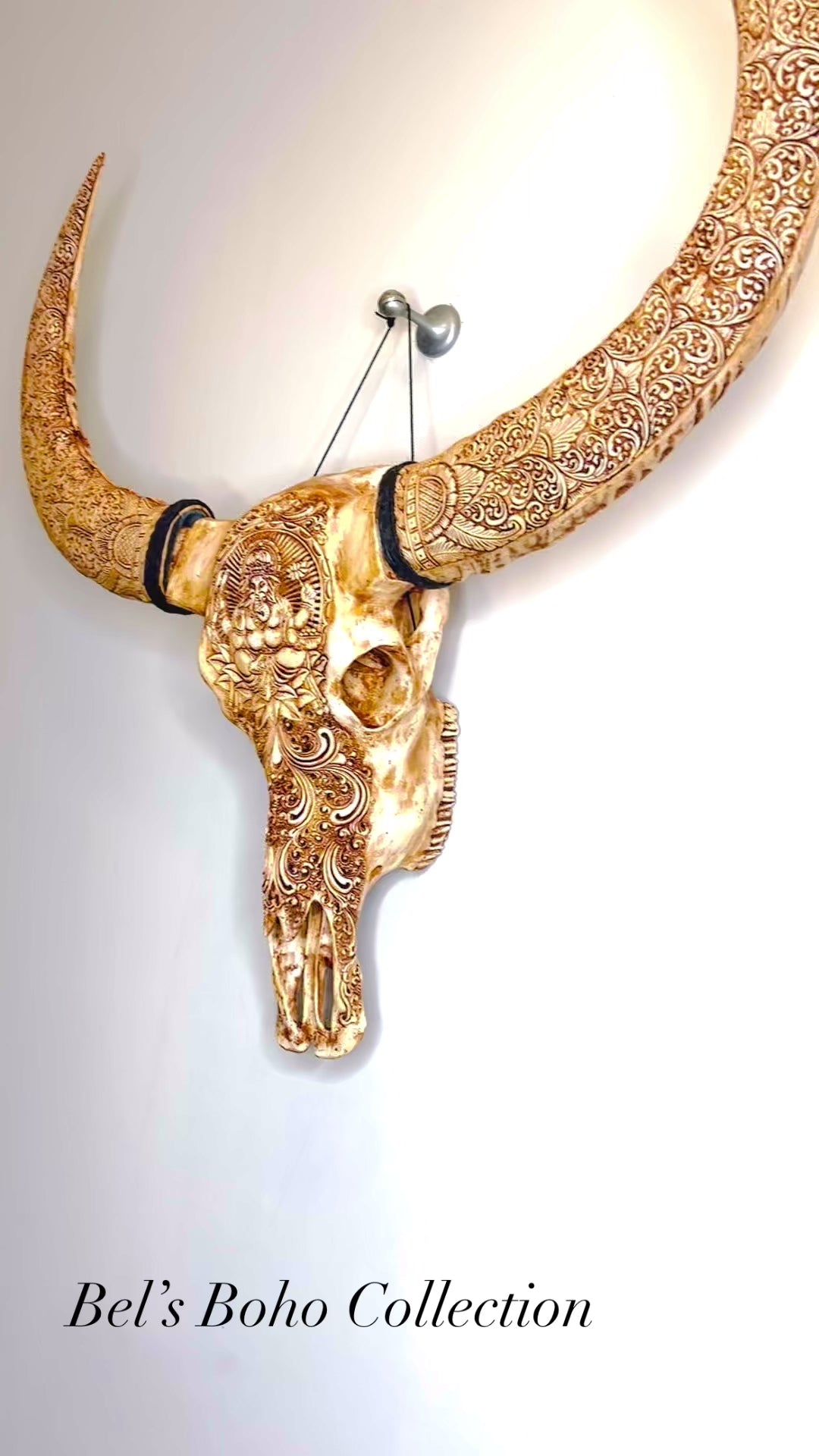 This intricately hand-carved resin buffalo skull is a stunning statement piece. Featuring exquisite detail & unique artistry, it brings bohemian elegance & cultural depth to any space. Perfect as a focal point for a living room, entryway, or gallery wall, this one-of-a-kind creation combines rustic charm with bold sophistication. A true conversation starter!