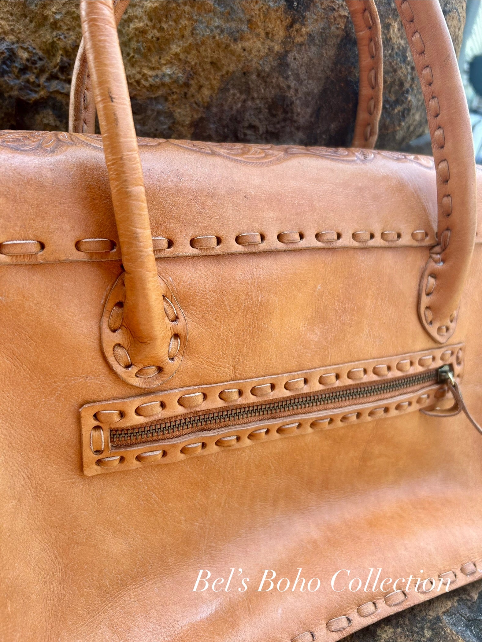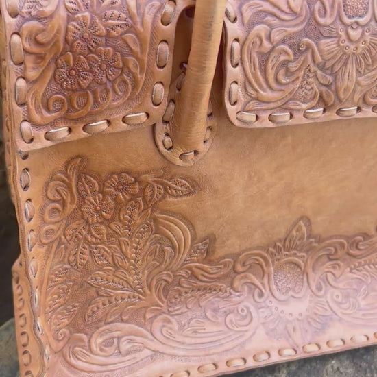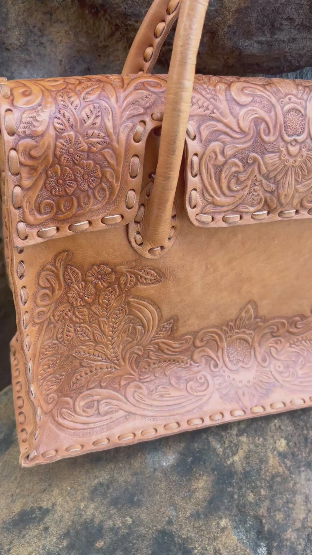 Turn heads with this stunning handcrafted leather handbag, featuring intricate Western-style floral tooling across every panel. Made from premium quality leather, this piece showcases exceptional detail-from the beautifully carved front & flap to the sturdy rolled handles & hand-stitched edging.