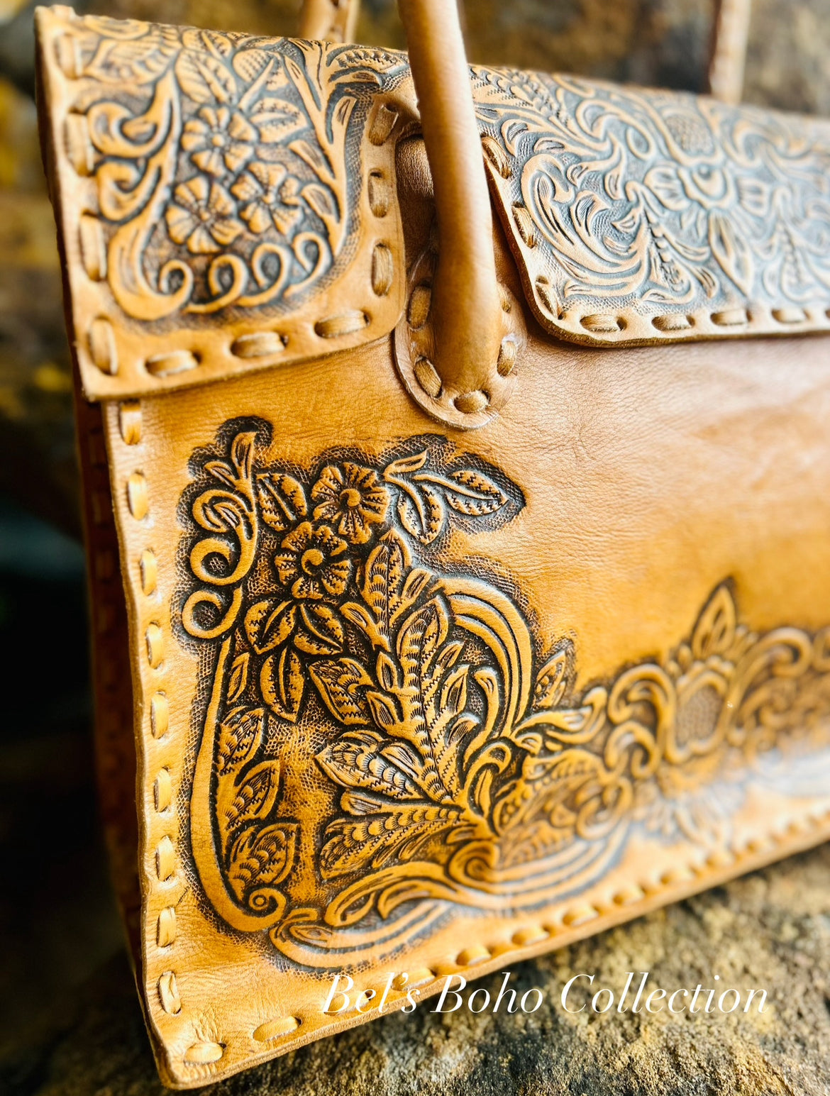 Turn heads with this stunning handcrafted leather handbag, featuring intricate Western-style floral tooling across every panel. Made from premium quality leather, this piece showcases exceptional detail-from the beautifully carved front & flap to the sturdy rolled handles & hand-stitched edging.